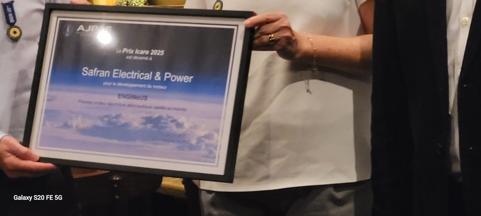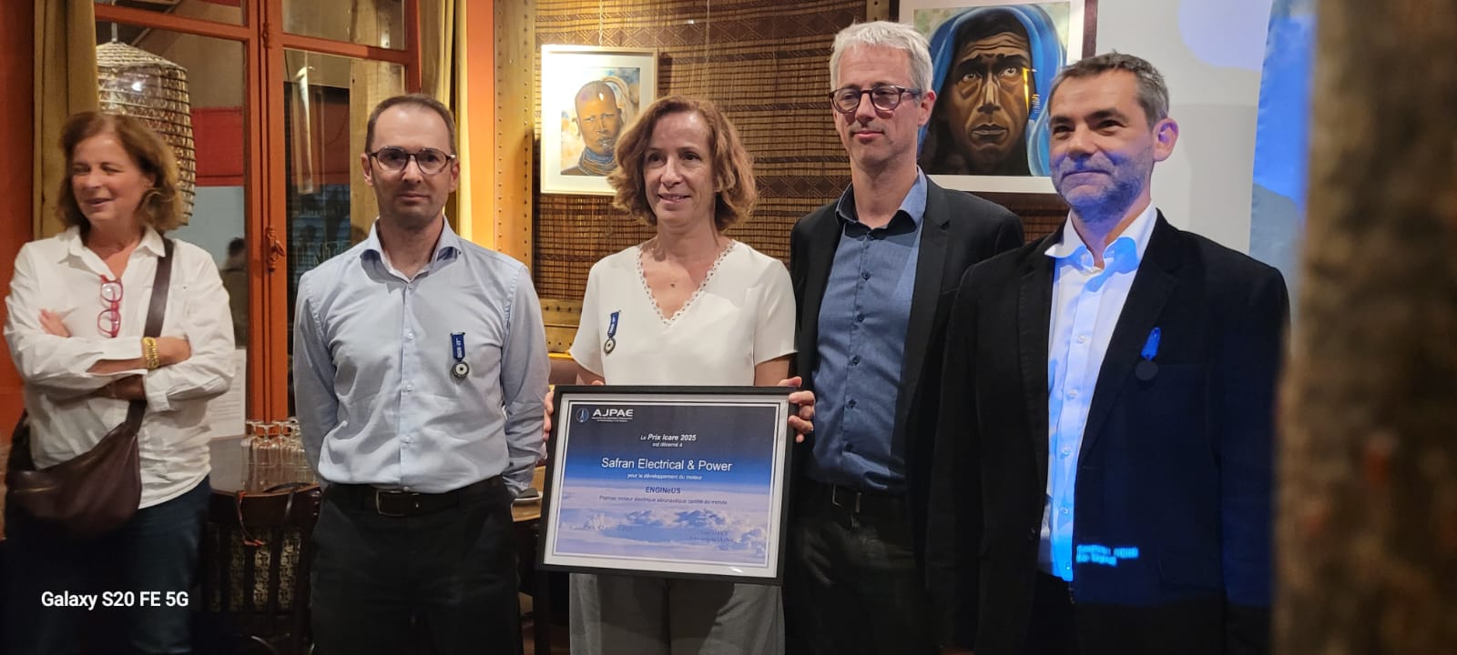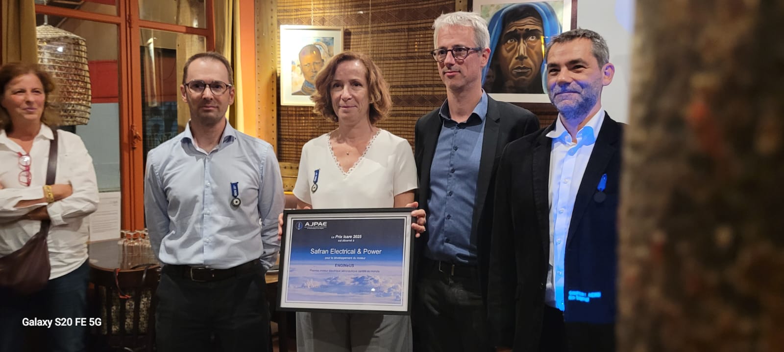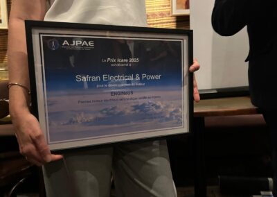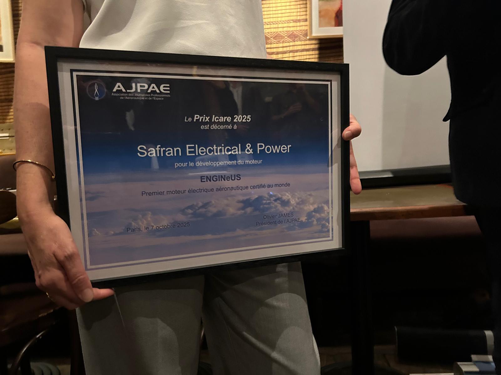 Le mardi 7 octobre 2025, Safran Electrical & Power s’est vue remettre le 68ème Prix Icare de l’AJPAE – Association des Journalistes Professionnels de l’Aéronautique et de l’Espace pour le développement du premier moteur électrique aéronautique certifié au monde : ENGENeUS 100.