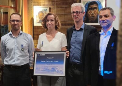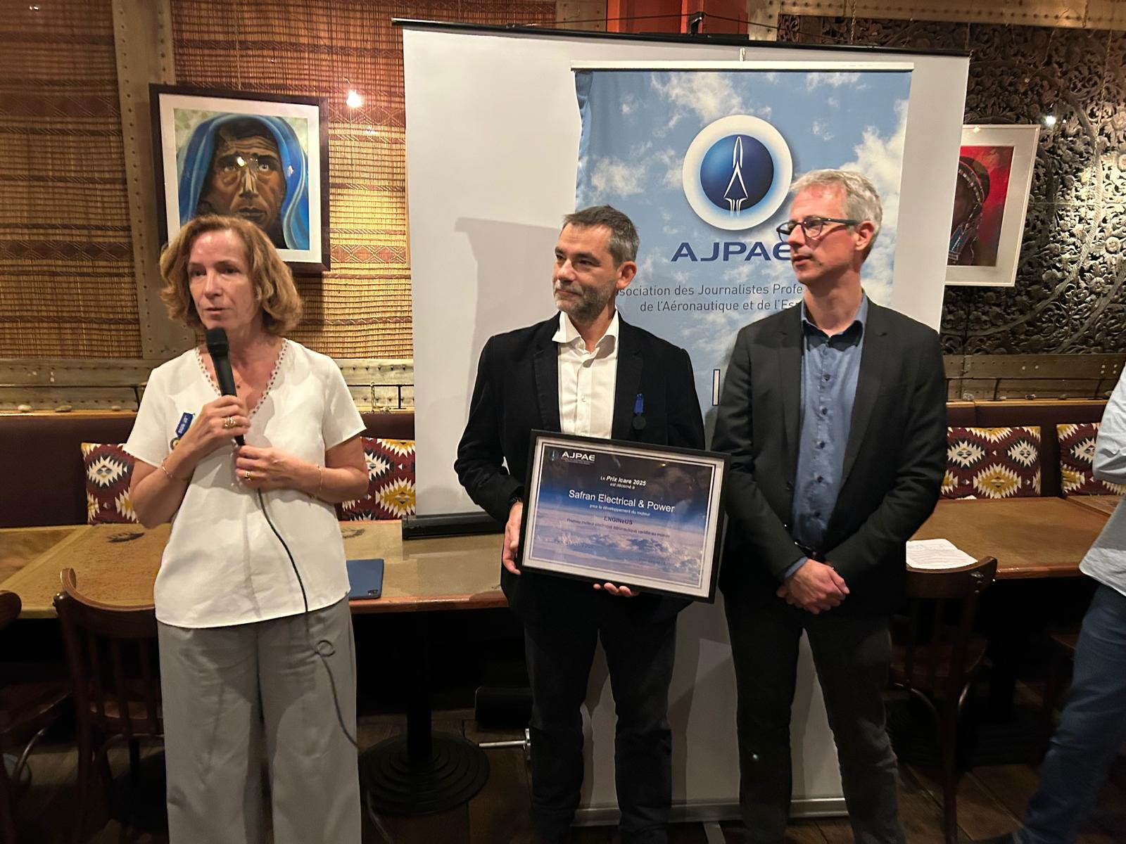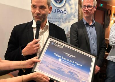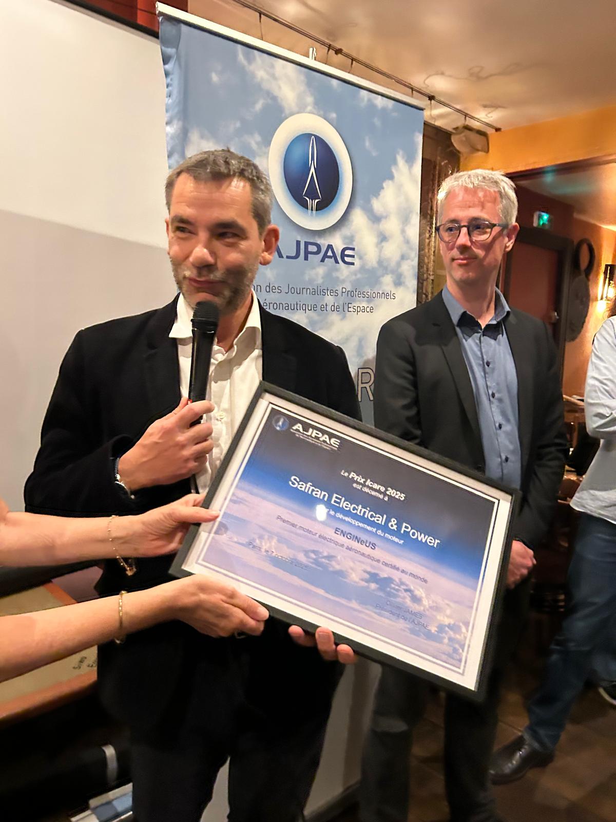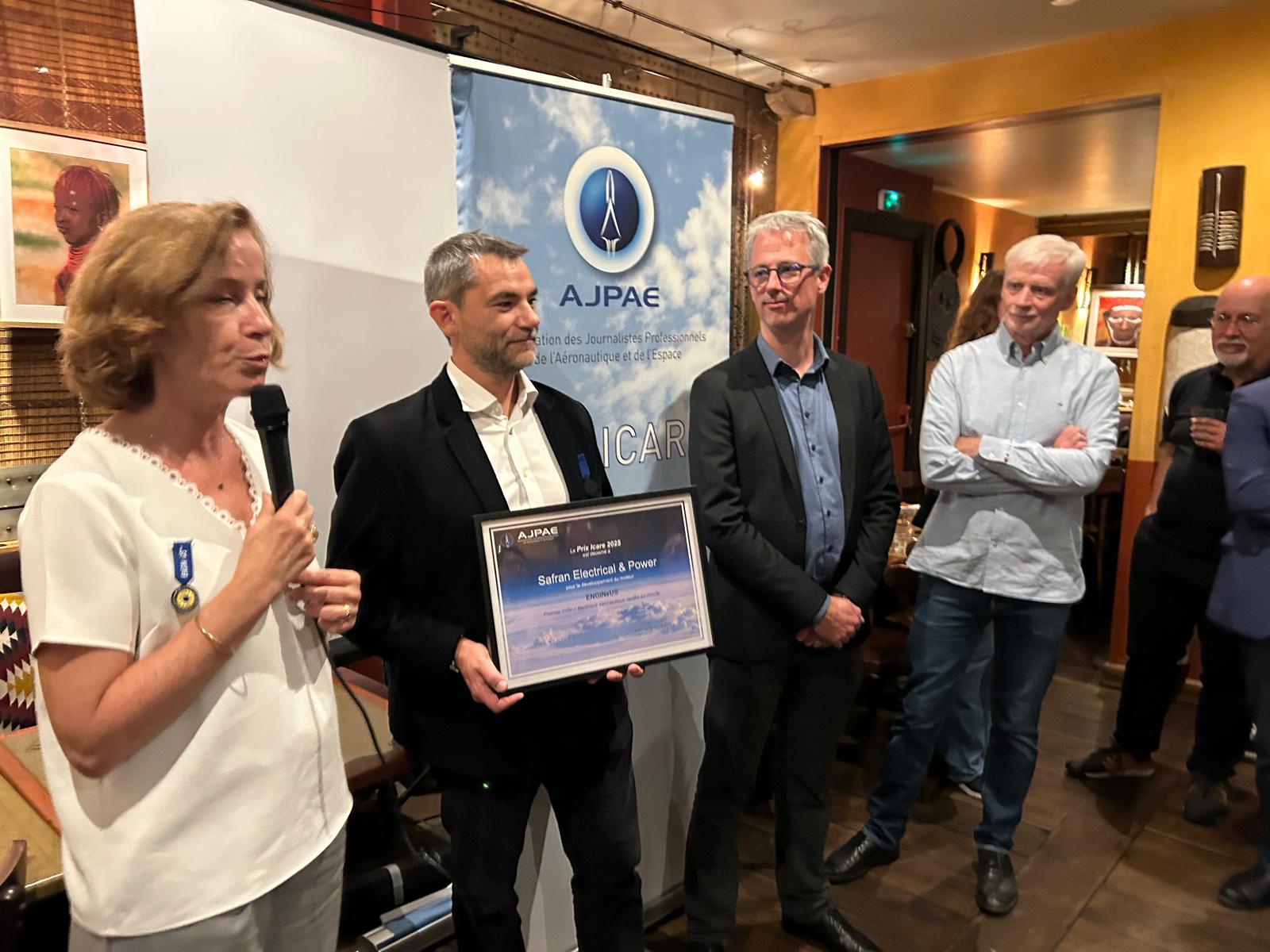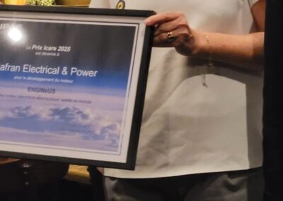 Le mardi 7 octobre 2025, Safran Electrical & Power s’est vue remettre le 68ème Prix Icare de l’AJPAE – Association des Journalistes Professionnels de l’Aéronautique et de l’Espace pour le développement du premier moteur électrique aéronautique certifié au monde : ENGENeUS 100.